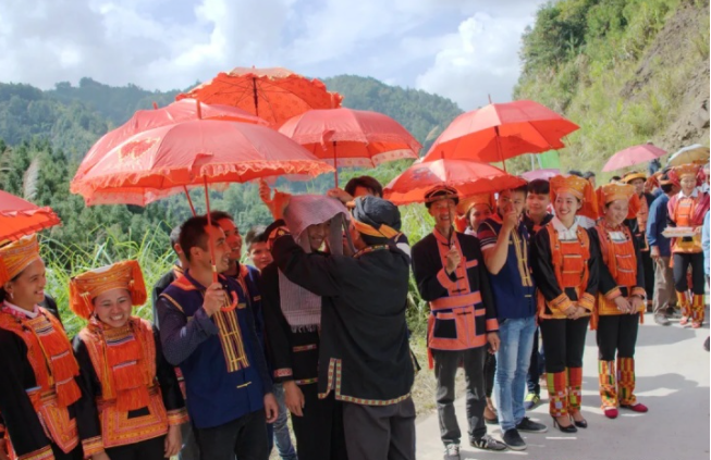 在贵州从江,瑶族的婚礼仪式历来古老而神秘,不仅具有独特的传奇色彩,而且具有深厚的民族文化内涵。广西金秀瑶族自治县是中国最早成立的瑶族自治县,盘瑶、茶山瑶、花蓝瑶、山子瑶、坳瑶五个支系形成了多彩的瑶族文化,“嫁郎” 是盘瑶代表性的习俗。因为瑶族人大多生活在茫茫的原始森林中,这里山多、风景如画,很少受到外来文化的影响,所以他们仍然保留着自己传统而原始的民族文化。其中,“嫁郎”习俗——瑶族的婚姻和十二崇拜也有自己浓厚的民族风格。天刚亮,山路上出现数十人的送亲队伍,簇拥着一个男人,新郎? 对,这是广西金秀瑶族自治县盘瑶支系特有的婚俗——嫁郎什么是“嫁郎” “嫁郎”是瑶族新郎在娘家定居的俗称,有别于其他民族的“招婆家”。姚新郎在女方家定居后,不得不改姓为女方姓,与女方家庭无关,而是宗族关系,是家族香火的传承人。另外,“嫁老公”是基于自由恋爱。大多数女性只是女儿或者有很多女性的家庭。男方来女方家,要照顾家庭,赡养老人,维持家庭。瑶族“嫁郎”家庭夫妻和睦,家庭稳定。离婚和赡养老人的失败很少发生。在瑶族传统文化中,是男女平等、忠孝仁义的道德典范。 “嫁郎”那天早上,天刚亮,新娘家已经灯火通明,到处都是亲朋好友,大家都在等新郎的到来。这时,新娘的主人拿着锣,在走廊栏杆外敲了几下,向村里喊着“接新人”。这时,礼乐大师们吹唢呐,敲锣打鼓,到新郎家接新娘,唢呐、锣鼓、鞭炮一路响到新郎家。身着瑶族传统服饰的新郎面带微笑地等待着。过了一会儿,出门的时候响起了鞭炮声,新郎新娘走进房间,用毛巾把新郎牵出了家门。门外,随行的郎为他拿起一把红伞,跟在师傅身后,和新郎新娘一起走了出去。迎亲队伍没有直接去新娘家,而是沿着公路在村子里走来走去。一路上,村里有亲朋好友的鞭炮和烟花,特别开心。 游行队伍欢迎新郎到新娘家,新娘穿着婚纱在厨房的壁炉旁等候。进门时,新郎用左脚跨过门槛,然后在丈夫的帮助下下到正房。大殿的神龛上贴满了红色的对联,神龛前的地上铺着红色的嫁衣,一对新人被领到了嫁衣前。迎新娘子仪式开始,仪式由阴阳先生主持,他宣读了拜夫妻、拜美女、拜全家、拜金银满仓、拜他们有多有钱等等仪式词。新娘和新郎拜了十二次神。 瑶族婚礼十二拜 即:一拜祖宗香火, 二拜上堂父母, 三拜上堂伯父, 四拜四季平安, 五拜五子登科, 六拜季花宝贵, 七拜七子团圆, 八拜八路齐传, 九拜五谷丰登, 十拜风调雨顺, 十一拜富贵双全, 十二拜拜兴又拜旺,拜吉又拜利。 这十二拜中既有忠孝,又有祈祷。 瑶族的“婚姻”和女性的“婚姻”是一样的,都被视为一件平常的事,不会被嘲笑和歧视。“嫁郎”与历史上瑶族艰难的迁徙过程有关,因为在迁徙过程中,瑶族人口较少,为“传宗接代”和对祖先、神灵的承诺而形成的婚俗。年轻的瑶族男女自古以来自由恋爱,父母从不随意干涉。然而,老年人在选择婚期时特别谨慎和认真。他们按照“角、足、商、征、羽、宫”五音计算,一姓一音:角音属木,商音属金,征音属火,羽音属水,宫音属土。只有所有的音调都匹配并形成之后,他们才能结婚。
